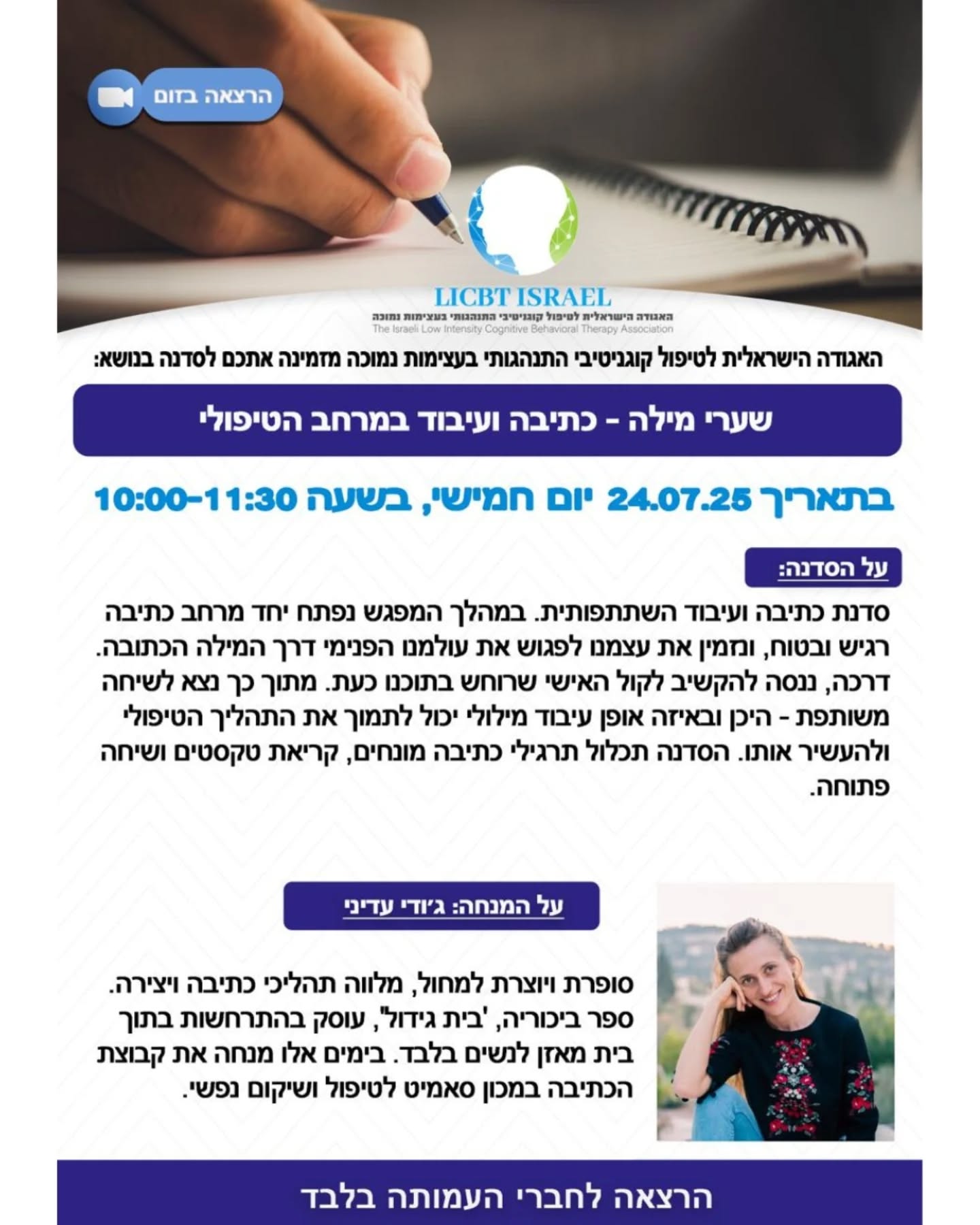 "שערי מילה" סדנה בת מפגש אחד על כתיבה ועיבוד במרחב הטיפולי* - ג'ודי עדיני